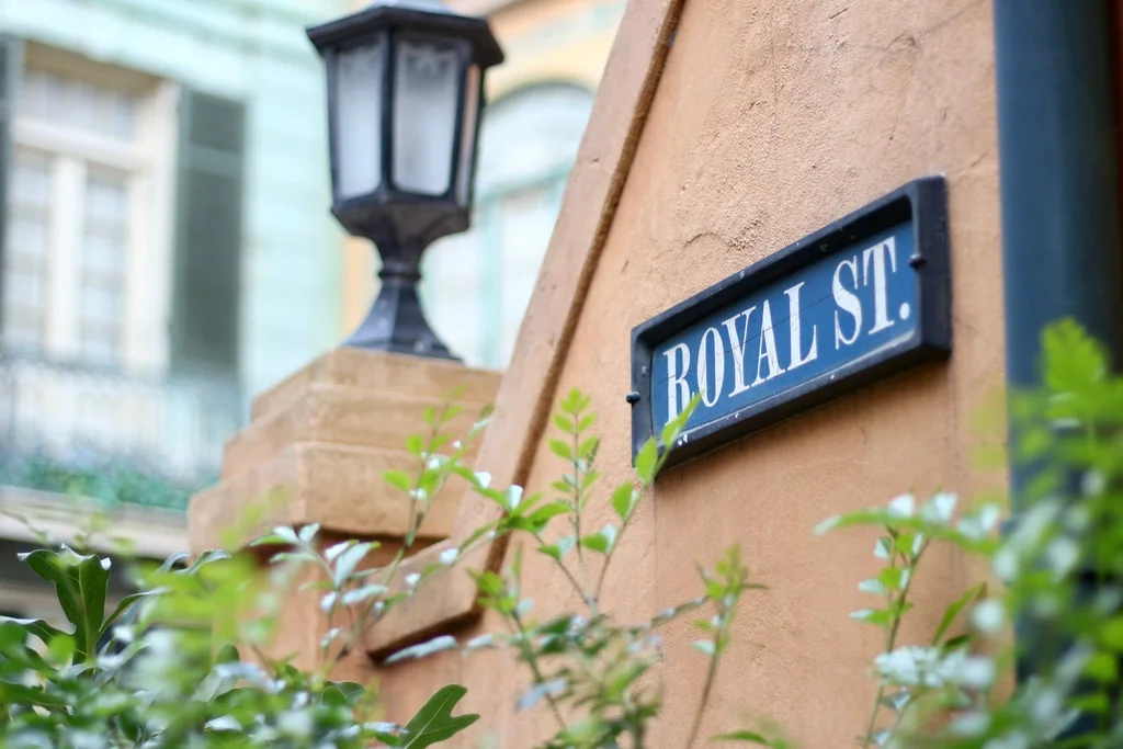いいボケ感の出た「ロイヤルストリート」の看板。カリブの海賊あたりから続くディズニーランド随一のおしゃれ小道だ。