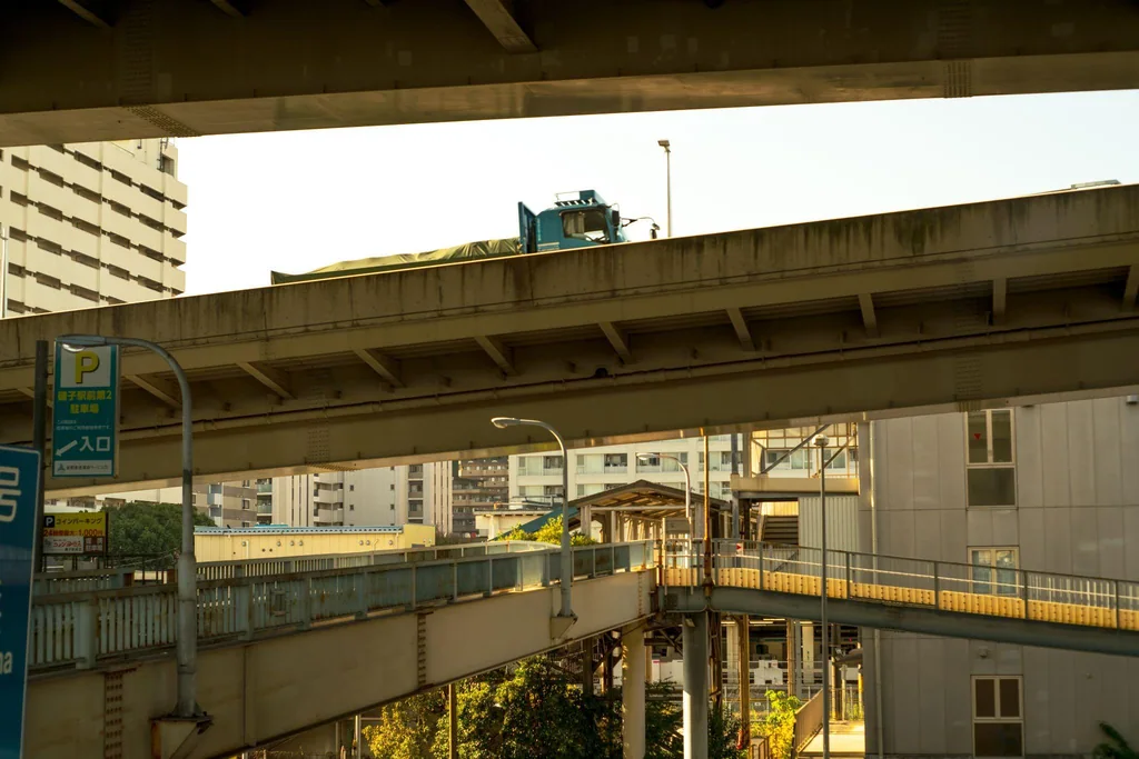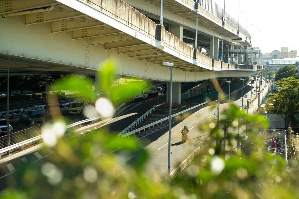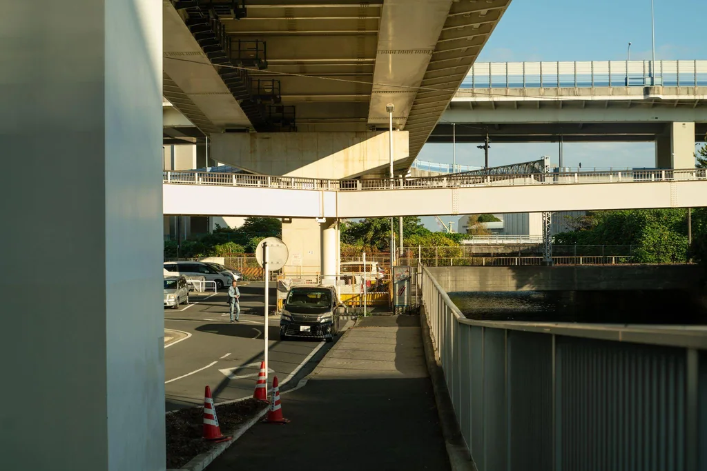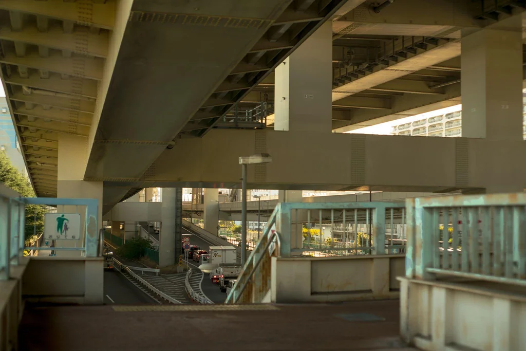 駅のコンコースを出ると歩道橋に直結していて、目下には湾岸道路、頭上にはあばら骨のような凹凸を見せる首都高速湾岸線が延びている。