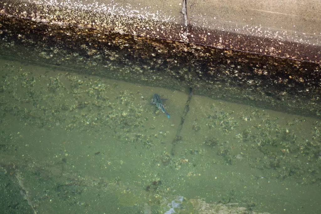 googleを見放し、AIガイドを頼りに正しい進路で向かう。郵便局隣の用水路を覗くと見るからに淡水魚ではなさそうな見た目の魚が泳いでいる。ぽつんと1匹でいたので分水路からこちらに迷い込んでしまったのかもしれない。
