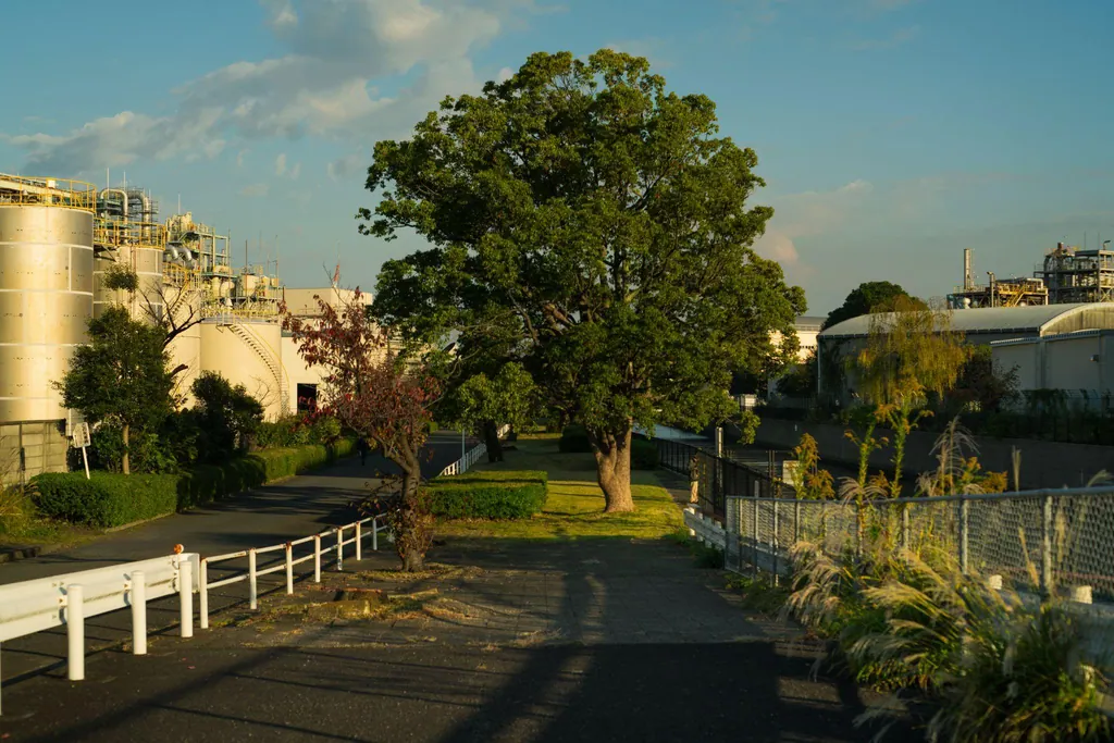 湾岸道路沿いに5分ほど歩くとついに工場地帯が見えてきた。左の道には歩道がなく、やはり歩行者を想定していないエリアなのだと実感する。とはいえ侵入が禁止されているわけでもなさそうなので勇気を持って進む。