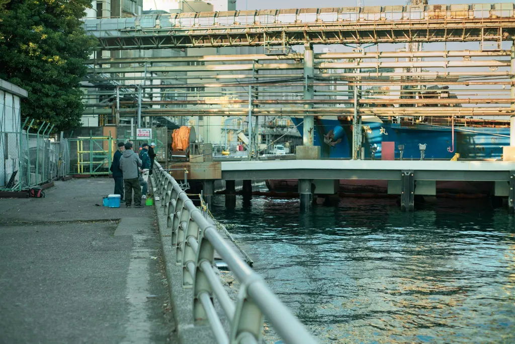 ブイが仕切る港と分水路の境目。水中がどういう仕組みになっているかは分からないがこれでは迷い込む魚が居ても無理はないかもなと思った。向こうに広がる景色もずっと工場ばかり。こことは別に海釣り施設があると聞いたがそれらしきものは近くに見当たらなかった。