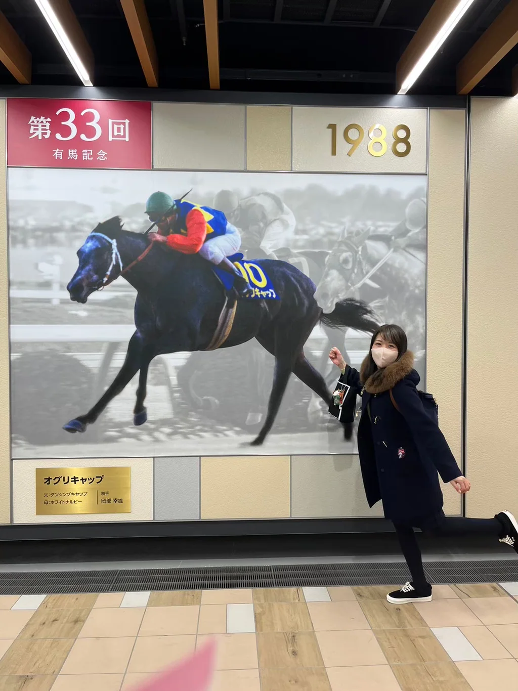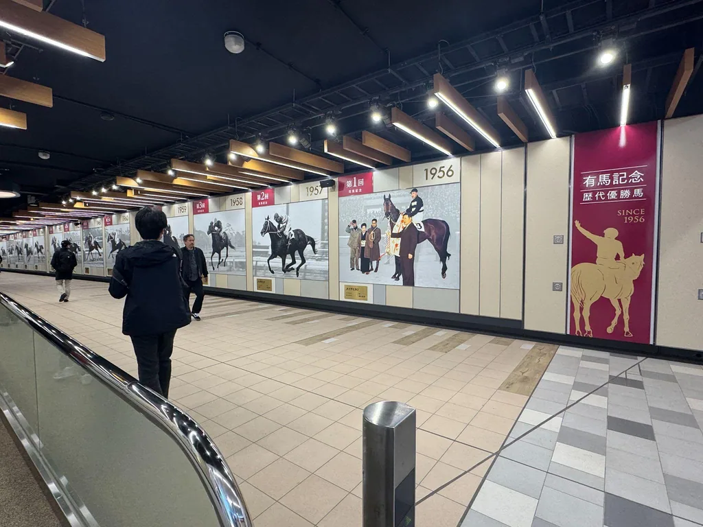 専用地下道から競馬場までは徒歩10分くらい、割と長い道のりなのだが「メモリアルウォーク」と呼ばれる、中山競馬の歴史を彩ってきた有馬記念や皐月賞の優勝歴代名馬たちのパネル展示がされているので、楽しみながら歩くことができる。