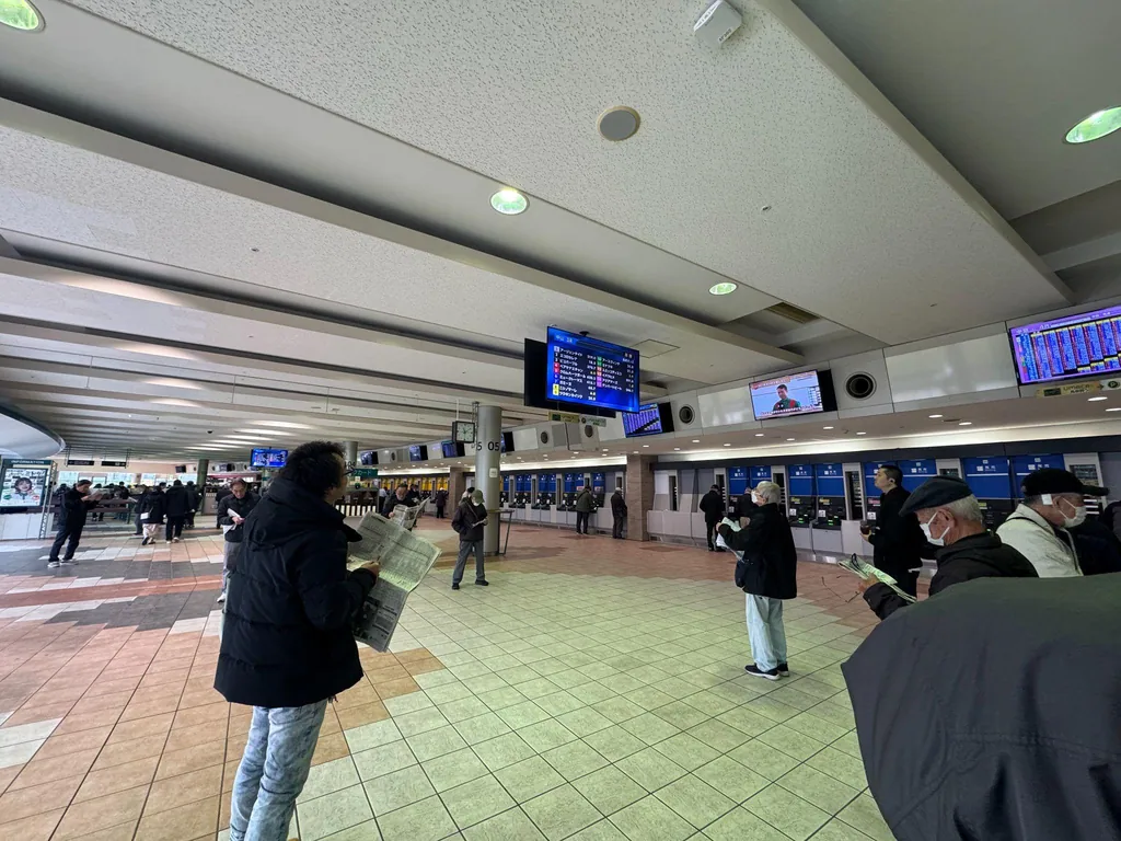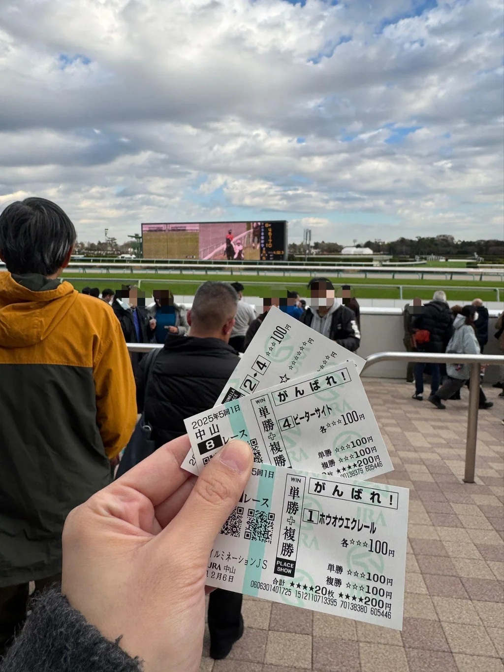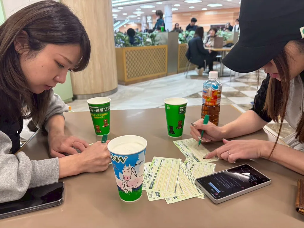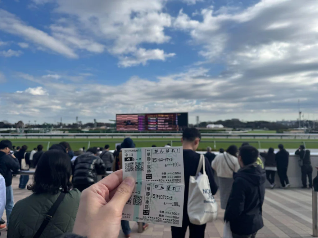 この間に待機している友人に先程のミドルエイジが「4連勝!」と声を掛けたり、場所取りシニアが戻ってきて一瞬相席になったりなどしていた。シニアは荷物を置いたまま、またどこかへ行った。この日は阪神・中京競馬場もレースを開催していたので、おそらく中山競馬場だけでなく、他の競馬場の馬券購入にも忙しいのだろう。