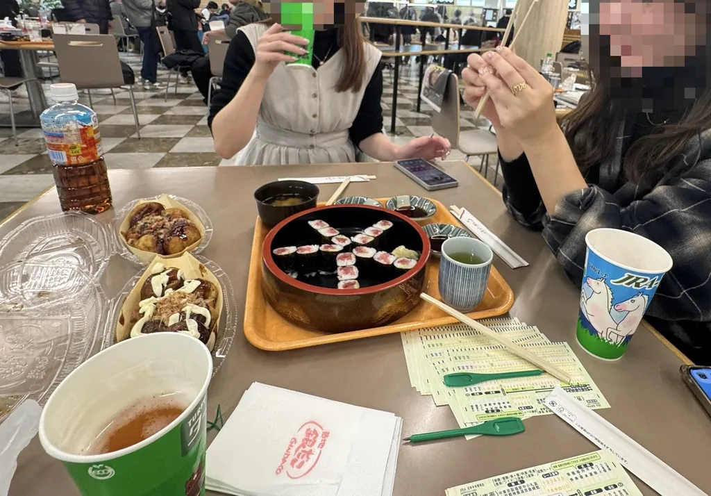 「最悪じいさん戻ってきたら相席でいいか、我々は寿司ちゃんと買うしな」とシニアの荷物を気持ち端に寄せ、半ば強引だが席を確保した。