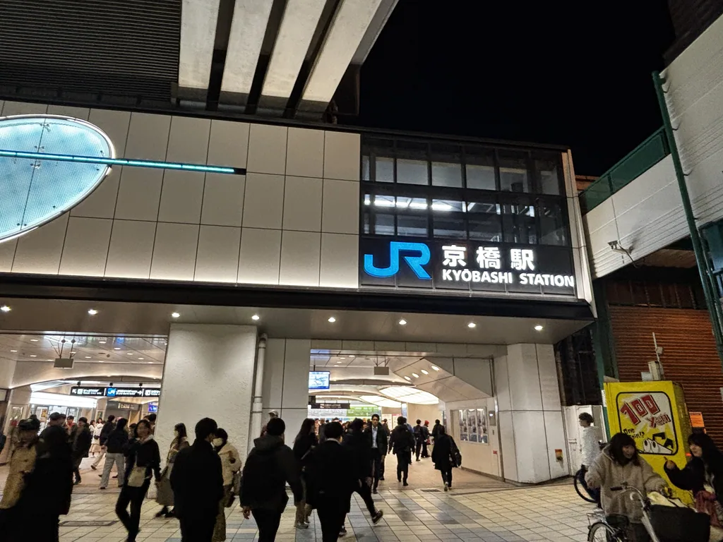 4駅目の京橋駅に到着。今日はこの駅の近くにホテルを取っているので今夜は終電までにここに戻る必要があります。