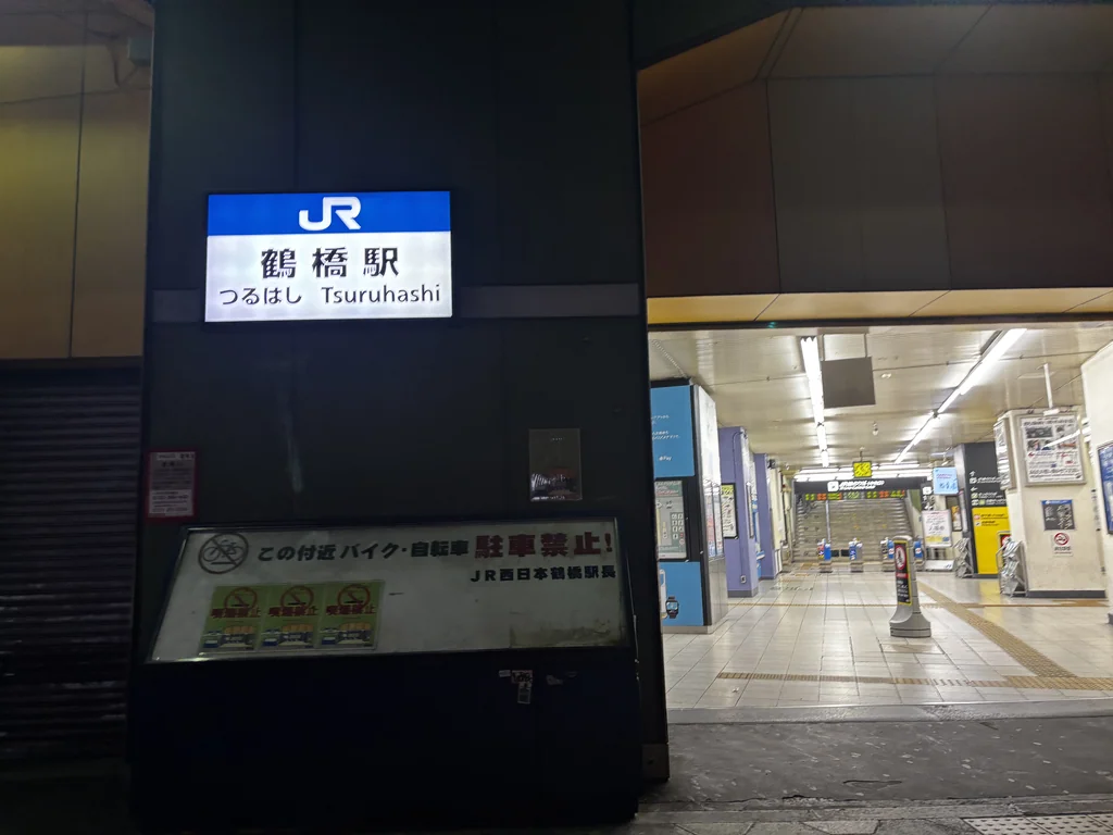 8駅目の鶴橋駅に到着したのは23:30。さすがに遅いので今日はここまでにしておこうかと思います。
