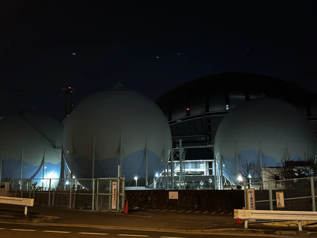 ガスタンクの後ろにうっすらと見える巨大なUFOのような建築物。