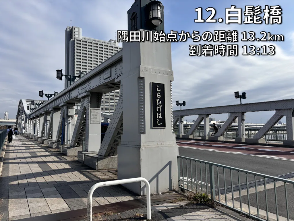 写真に隅田川始点からの距離と時間を載せているのでご参考までに。
