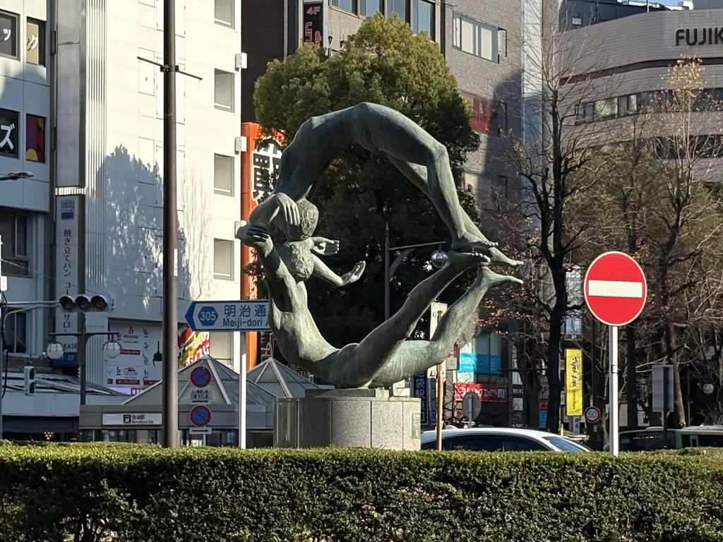 駅前に、ヘルニアの人は絶対に真似できない体勢の銅像がありました。家賃相場は1M8.8万円。お得感がありますが、駅前が怖いので住めなさそうです。