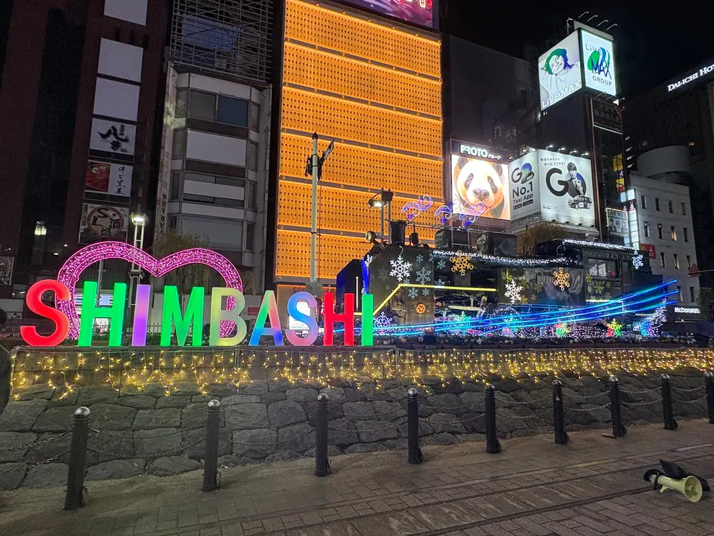 新橋駅の目の前の広場に、観光地とかでよく見る「ローマ字表記のでかい看板」がありました。「SHIMBASHI」がNではなくMなのは、ヘボン式ローマ字だからだそうです。またひとつ賢くなりました。